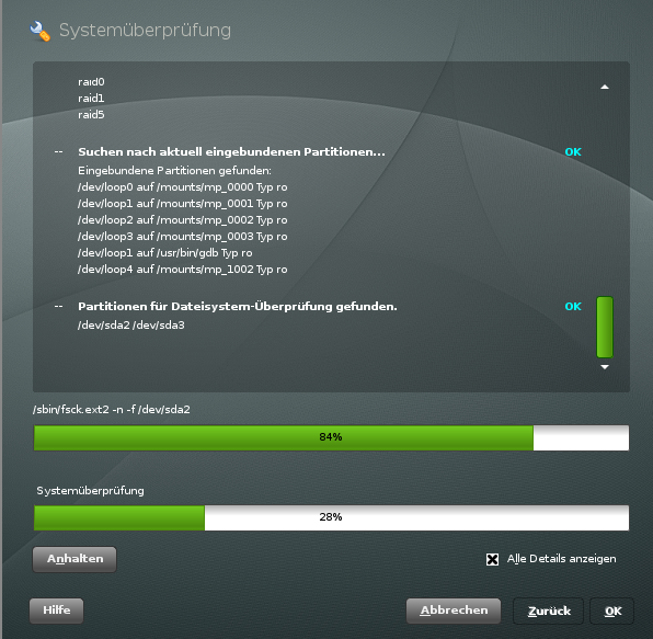Alle erkannten Dateisysteme werden einer dateisystemspezifischen Prüfung unterzogen.