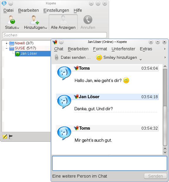 Kopete ist eine Online-Messenger-Anwendung, mit der mehrer Personen über das Internet miteinander chatten können. Kopete unterstützt derzeit alle bekannten Messenger-Protokolle, wie AOL* Instant Messenger (AIM), Gadu-Gadu, GroupWise® Messenger, ICQ, Jabber*, SMS und Yahoo!*. Um Instant Messaging (IM) verwenden zu können, müssen Sie sich beim einem Provider von IM-Diensten registrieren und ein Kopete-Konto konfigurieren.