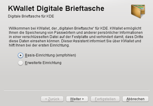 Wenn Sie in einer KDE-Anwendung zum ersten Mal ein Passwort eingeben (zum Beispiel in KMail oder in Konqueror), werden Sie gefragt, ob Sie das Passwort speichern möchten. Wenn Sie auf klicken, startet standardmäßig der KWallet-Assistent. KWallet ist ein Werkzeug zur Passwortverwaltung, das alle Passwörter sammeln und in einer oder mehreren verschlüsselten Dateien (sogenannten Brieftaschen) speichern kann.