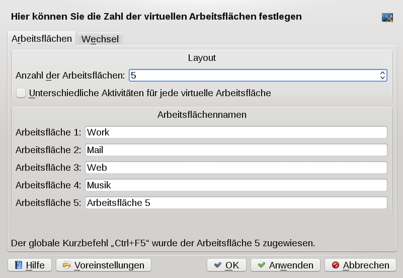 Sie können die Anzahl der virtuellen Desktops erhöhen, die Standardnamen ändern, Aktivitäten zuweisen, Effektanimationen konfigurieren und Tastaturkürzel für das Umschalten der virtuellen Desktops zuweisen.
