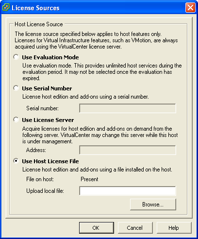 Wählen Sie (Host-Lizenzdatei verwenden), klicken Sie auf (Durchsuchen) und wählen Sie dann die heruntergeladene Lizenzdatei aus. Weitere Informationen hierzu finden Sie unter Anfordern der ESX-Lizenzen:.