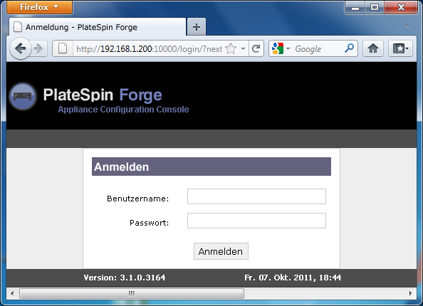 Forge-Web-Client: Schlagen Sie die Versionsnummer der Appliance auf der Seite des PlateSpin Forge-Web-Clients nach. Diese Methode ist nur bei der Neukonfiguration von Forge möglich.