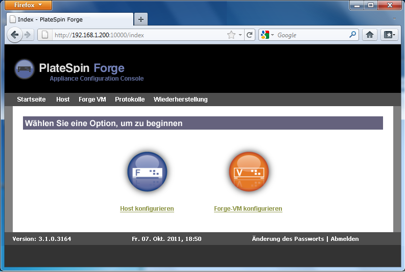 Stellen Sie beim erstmaligen Einschalten sicher, dass das PlateSpin Forge-Konfigurationsdialogfeld angezeigt wird.