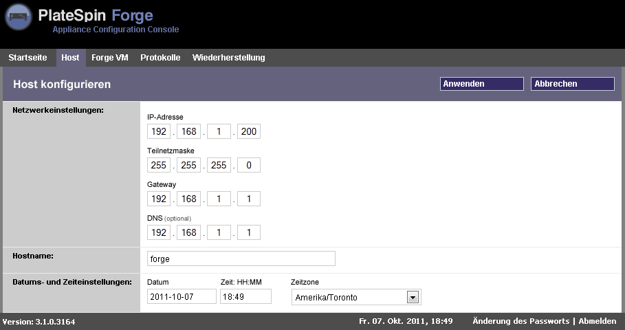 Die Ersteinrichtung und -konfiguration der PlateSpin Forge-Appliance muss nur einmal vorgenommen werden. Vermerken Sie alle relevanten Informationen auf dem ausgedruckten Konfigurationsarbeitsblatt, falls Sie sich bei Problemen bezüglich Einrichtung an den technischen Support von PlateSpin wenden müssen.