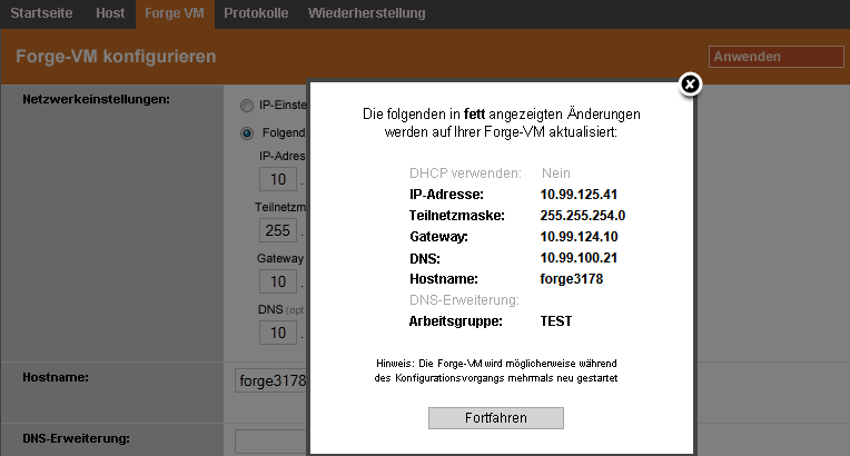 HINWEIS:Wenn Sie die Appliance erneut konfigurieren, d. h. dieses Verfahren nicht das erste Mal ausführen, fordert das System Sie auf zu prüfen, ob die neue Verbindung funktioniert. Wenn die Prüfung fehlschlägt, wird die Forge-IP-Adresse zurückgesetzt.