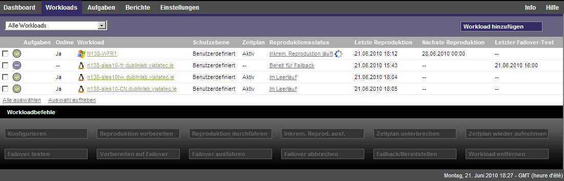 Befehle spiegeln den Workflow des Workload-Schutzes und der Wiederherstellung wider. Wählen Sie zur Ausführung eines Befehls für einen Workload das entsprechende Kontrollkästchen auf der linken Seite aus. Anwendbare Befehle hängen vom aktuellen Status eines Workloads ab.