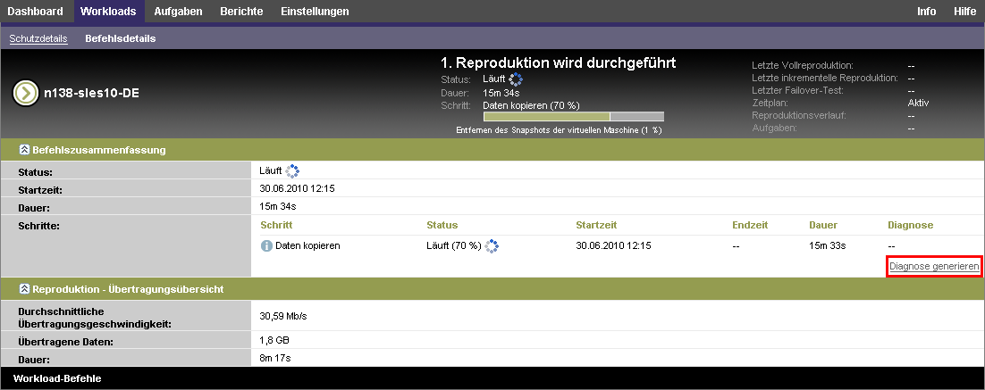 Nachdem Sie im PlateSpin Forge Web-Client einen Befehl ausgeführt haben, können Sie detaillierte Diagnoseberichte über die Details des Befehls generieren.