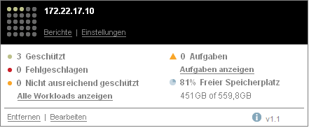 Hyperlinks auf jeder Karte ermöglichen Ihnen die Navigation zu den für diese Instanz spezifischen Seiten „Workloads“, „Berichte“, „Einstellungen“ und „Aufgaben“. Es gibt darüber hinaus Hyperlinks, über die Sie die Konfiguration einer Karte bearbeiten oder eine Karte aus der Anzeige entfernen können.