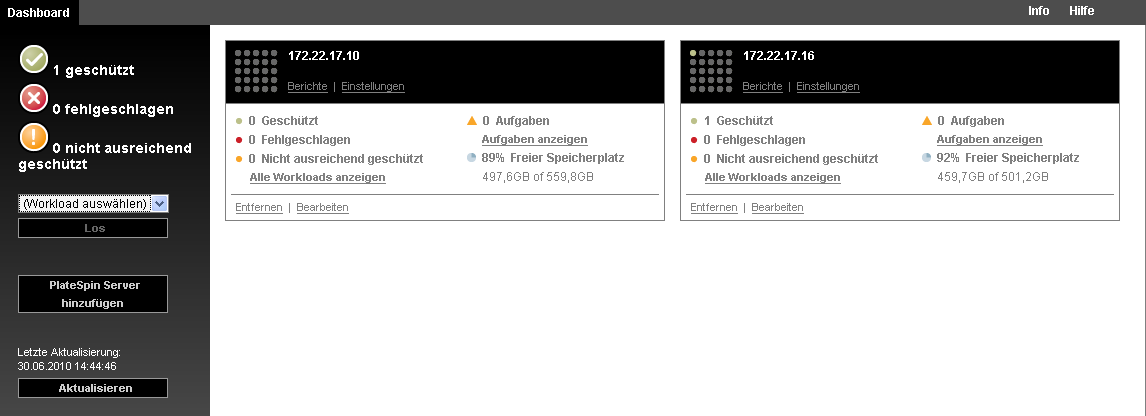 Beim Hinzufügen einer PlateSpin Forge-Instanz zur Verwaltungskonsole wird eine neue Karte zum Dashboard der Verwaltungskonsole hinzugefügt.