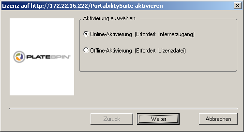 Für die Online-Aktivierung muss Ihr PlateSpin Migrate-Client auf das Internet zugreifen können.
