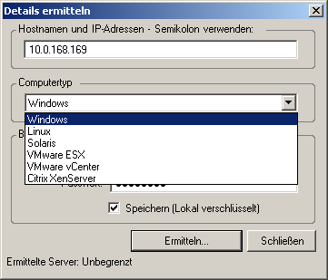 Wählen Sie den Computertyp aus und geben Sie den Administrator-Berechtigungsnachweis für den zu ermittelnden Computer an.