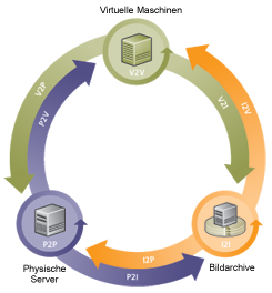 Konsolidierung. Automatisierung von umfangreichen Migrationen physischer Computer in virtuelle Maschinen, Beschleunigung von Konsolidierungsprojekten und Reduzierung von Verwaltungsaufwand und Fehlern.