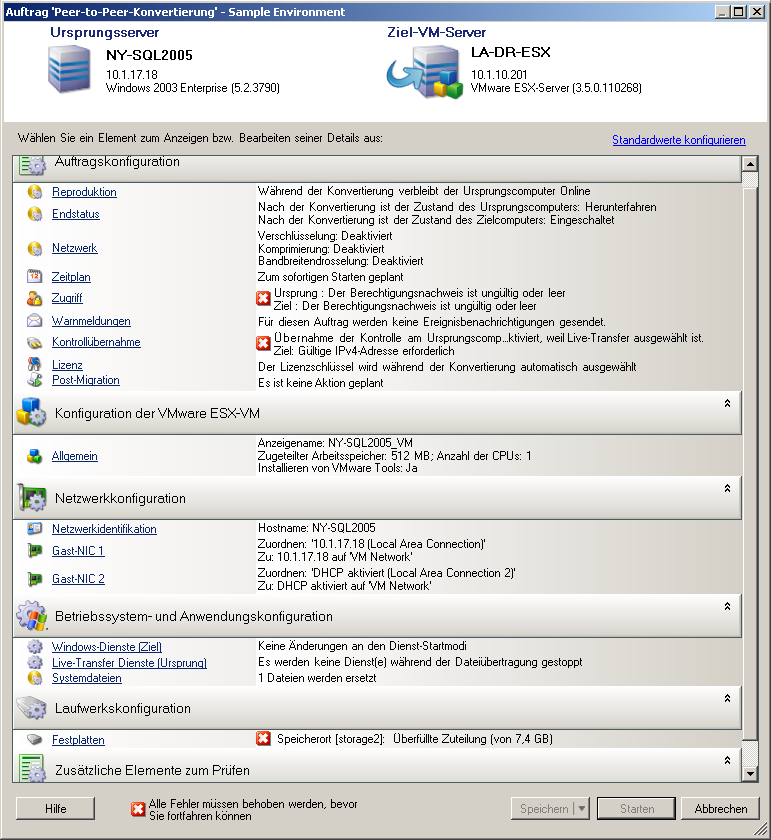Abbildung 4-1 Fenster „Auftrag 'Peer-to-Peer-Migration'“ (P2V im erweiterten Modus)