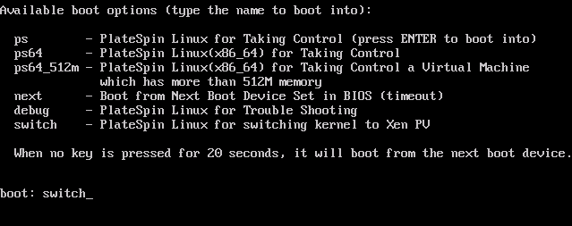 Die VM bootet in die PlateSpin-Betriebssystemumgebung, die in den X2P-Einstellungen angegeben ist.