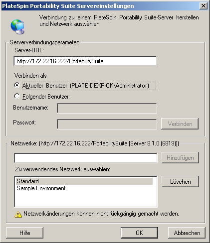 Sie geben Ihren Berechtigungsnachweis für die Verbindung, die Instanz des Portability Suite-Servers und das erforderliche Portability Suite-Netzwerk in den Portability Suite-Servereinstellungen an.