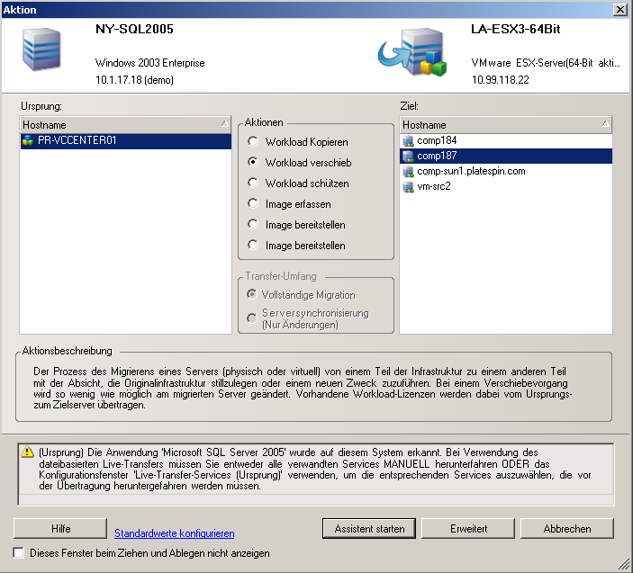 In den Ursprungs- und Zielfenstern werden Workloads und Ziele angezeigt, die dem ausgewählten Typ eines Konvertierungsauftrags entsprechen.
