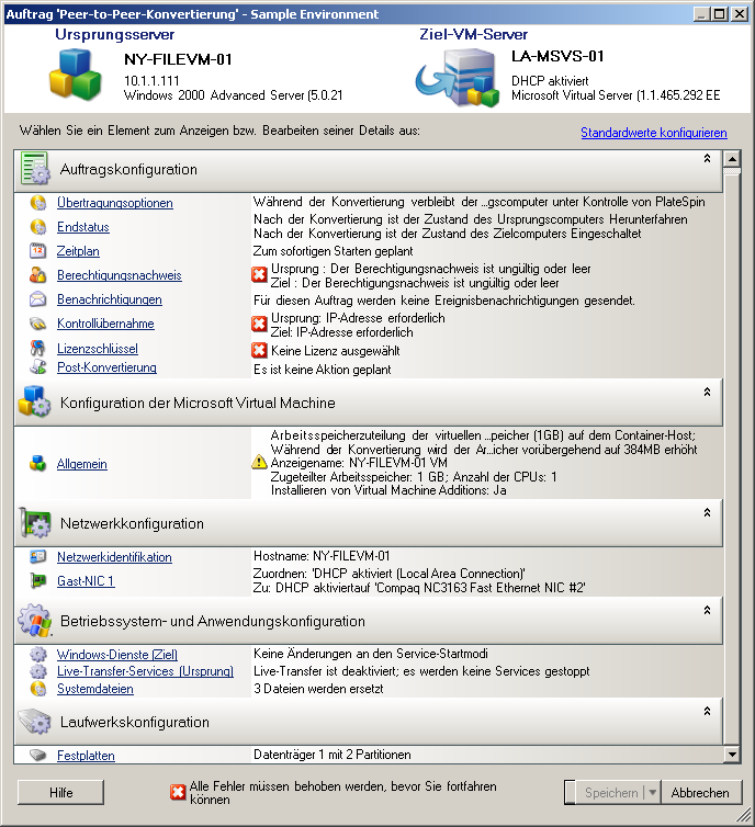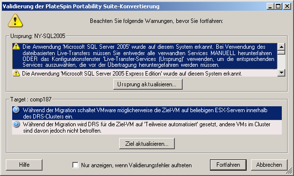 Beim Starten eines Konvertierungsauftrags überprüft Portability Suite den Auftragstyp, den Ursprung, das Ziel und die ausgewählten Parameter und gibt dabei möglicherweise Fehler- und Warnmeldungen aus.