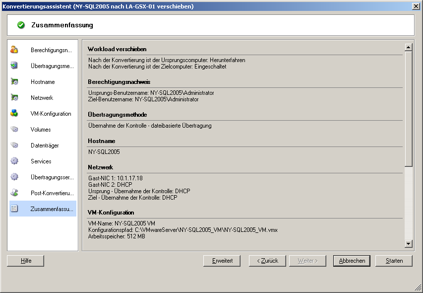 Erweiterte Optionen für die Konfiguration der Ziel-VM. Weitere Informationen hierzu finden Sie im Abschnitt Virtualisierungsplattform-spezifische und erweiterte VM-Konfigurationsoptionen.