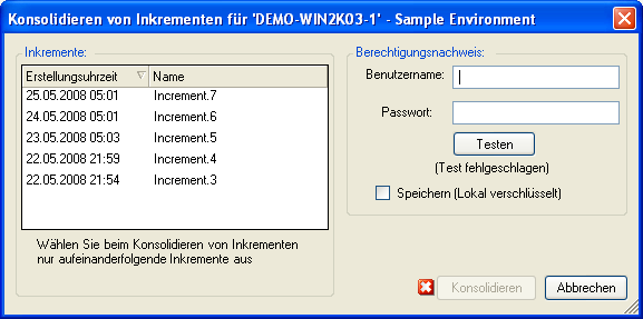 Bei der Inkrementenkonsolidierung werden zwei oder mehr Inkremente durch ein einzelnes, zusammengeführtes Image-Inkrement ersetzt. Sie können nur aufeinanderfolgende Inkremente konsolidieren.