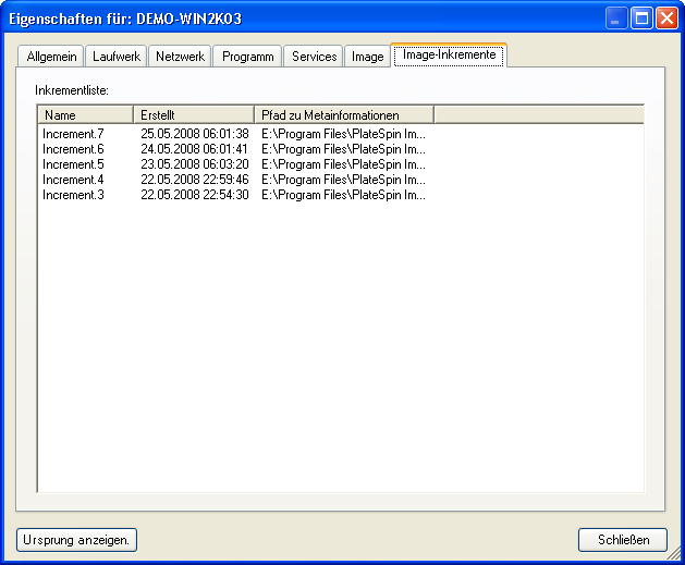 Es wird eine Liste mit allen Inkrementen des Images angezeigt. Die Liste enthält den Namen, das Datum und die Uhrzeit der Erstellung und den Pfad zu der Datei mit den Metadaten für jedes Inkrement.