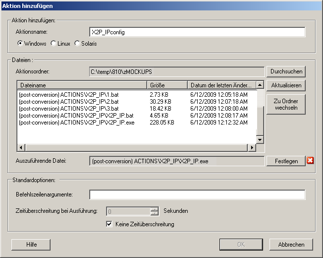 Zur Automatisierung bestimmter Post-Konvertierungsaufgaben auf dem Ziel können Sie eine benutzerdefinierte Aktion, z. B. eine Stapeldatei, ein Shell-Skript oder eine Programmdatei zum Konvertierungsauftrag hinzufügen. Am Ende des Konvertierungsprozesses lädt Portability Suite die angegebene Aktion zusammen mit deren Abhängigkeiten auf das Ziel und führt sie aus.
