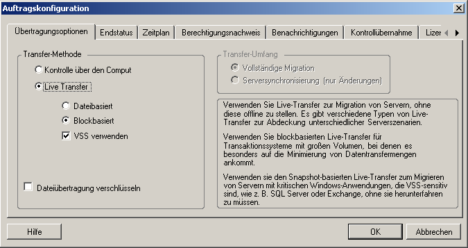 Der Umfang der vom Ursprung zum Ziel zu übertragenden Workload-Daten ( oder nur ). Steht nur für Serversynchronisierungsaufträge zur Verfügung. Weitere Informationen hierzu finden Sie im Abschnitt Synchronisieren von Workloads mit der Serversynchronisierungsfunktion.