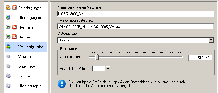 HINWEIS:Wenn Ihr Ziel-VMware ESX-Server Teil eines vollautomatischen DRS-Clusters (Distributed Resource Scheduler) ist, d. h., für die VM-Migration ist als Automatierungsstufe festgelegt, wird für die Dauer der Konvertierung die Automatisierungsstufe der neu erstellten Ziel-VM in geändert. Dies bedeutet, dass Ihre Ziel-VM möglicherweise auf einem anderen als dem ursprünglich ausgewählten ESX-Server gebootet wird, aber es wird verhindert, dass die Migration automatisch ausgeführt wird.