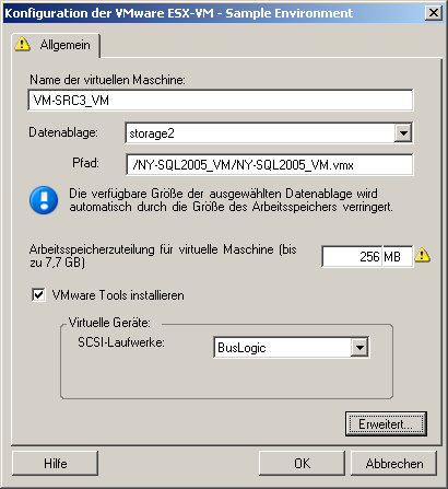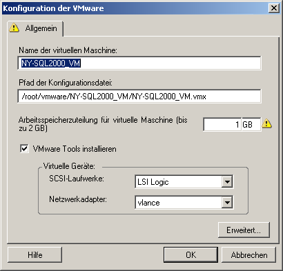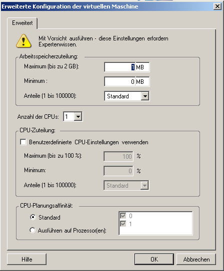 Folgende Konfigurationsoptionen sind spezifisch für VMware ESX 2. Klicken Sie auf , um auf die Einstellungen für die ESX 2-Arbeitsspeicherzuordnung, die CPU-Anzahl und die CPU-Planungsaffinität zuzugreifen.