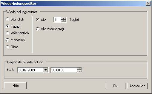 Klicken Sie zum Bearbeiten eines Zeitplans auf im Zeitplan des Auftrags. Die im Dialogfeld "Wiederholungseditor" angezeigten Optionen hängen von früheren Auftragskonfigurationseinstellungen ab.