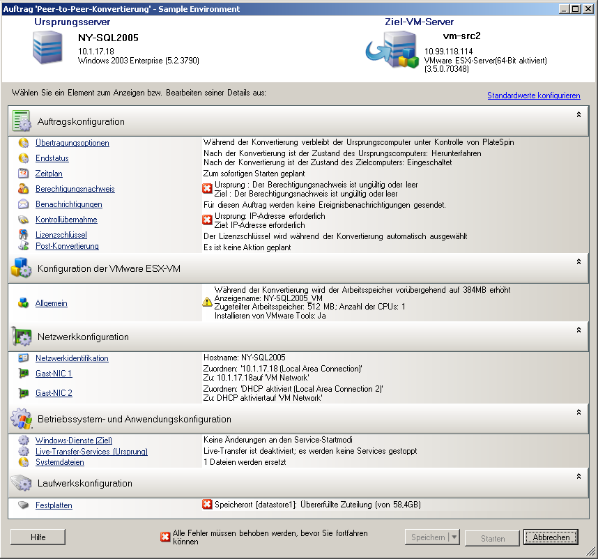 Abbildung 3-1 Fenster "Auftrag 'Peer-to-Peer-Konvertierung'" (P2V im erweiterten Modus)
