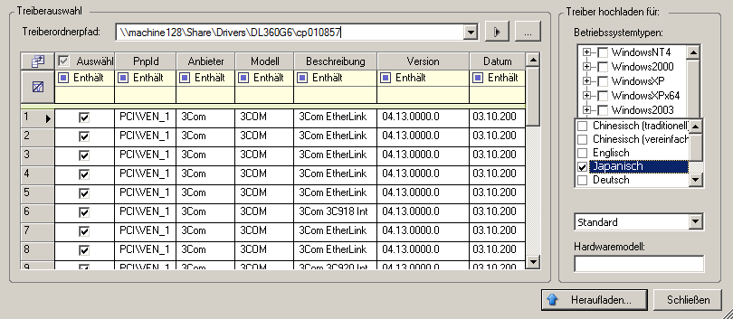 Klicken Sie auf , navigieren Sie zu dem Ordner, der die erforderlichen Treiberdateien enthält, und wählen Sie den zutreffenden Betriebssystemtyp, die Sprache und die Hardwarehersteller-Optionen aus.