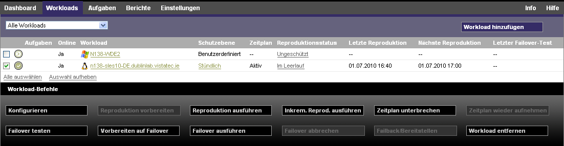 Befehle spiegeln den Workflow des Workload-Schutzes und der Wiederherstellung wider. Wählen Sie zur Ausführung eines Befehls für einen Workload das entsprechende Kontrollkästchen auf der linken Seite aus. Anwendbare Befehle hängen vom aktuellen Status eines Workloads ab.
