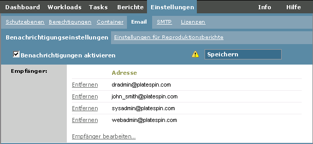 Sie können PlateSpin Protect so konfigurieren, dass es automatisch Benachrichtigungen zu Ereignissen und Reproduktionsberichte an angegebene Email-Adressen sendet. Für diese Funktion ist es erforderlich, dass Sie zuerst einen gültigen SMTP-Server für PlateSpin Protect angeben.