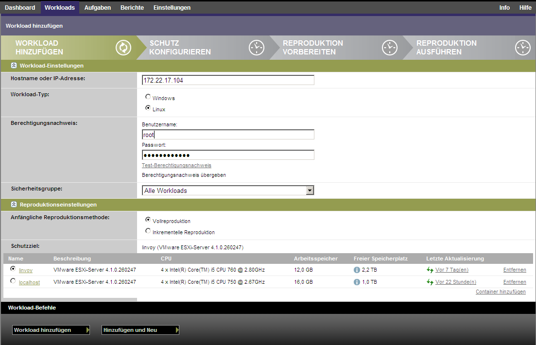 Auf der PlateSpin Protect-Weboberfläche wird die Seite „Workload hinzufügen“ angezeigt.