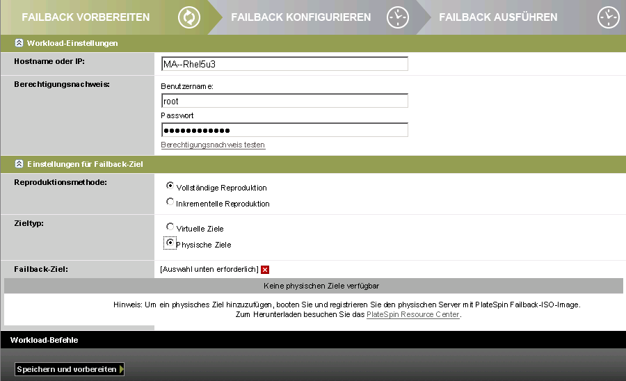 Gehen Sie folgendermaßen vor, um nach einem Failover den Failback eines Workloads an einen physischen Computer durchzuführen. Bei dem physischen Computer kann es sich um die ursprüngliche oder eine neue Infrastruktur handeln.