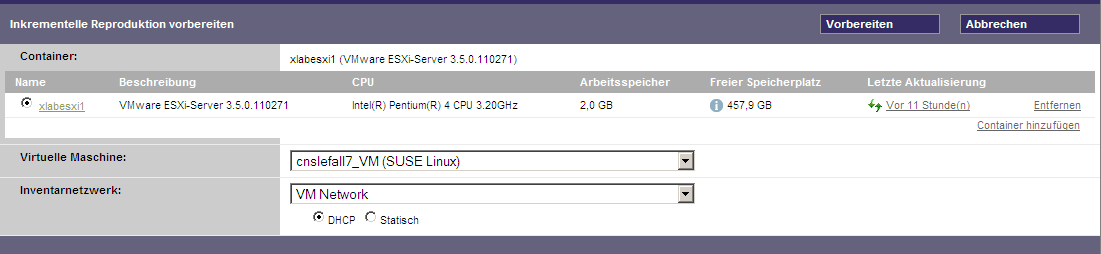 Wählen Sie den erforderlichen Container, die virtuelle Maschine und das Inventarnetzwerk aus, das für die Kommunikation mit der VM verwendet werden soll.