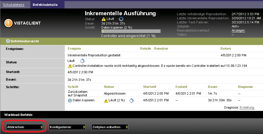 Auf der Seite "Befehlsdetails" eines bestimmten Befehls können sie diesen nach dessen Ausführung abbrechen, solange er noch nicht durchgeführt wurde.