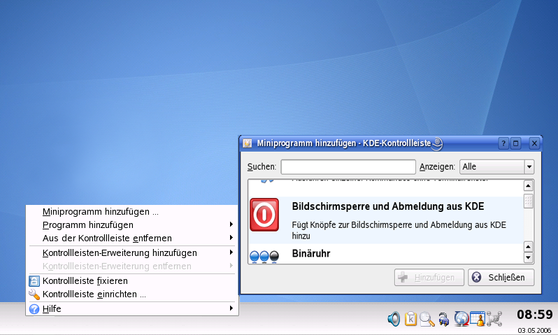 Sie können die KDE-Kontrollleiste entsprechend Ihrer Präferenzen anpassen, indem Sie Symbole hinzufügen, löschen oder verschieben oder das Gesamterscheinungsbild der Kontrollleiste verändern.