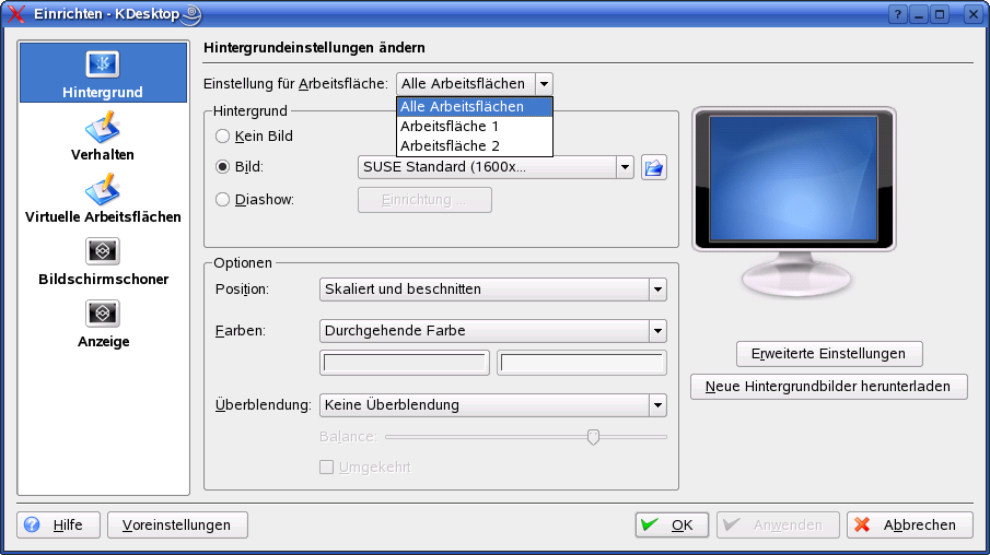 Sie können die Hintergrundfarben Ihres Desktops ändern oder ein Bild auswählen, das als Hintergrund verwendet werden soll. Da KDE virtuelle Desktops bietet (siehe Abschnitt 4.0, Verwenden von virtuellen Desktops), können Sie diese Änderungen auf einen oder alle Ihre virtuellen Desktops anwenden.
