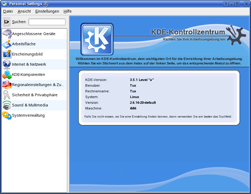 Außer dem Ändern einzelner Desktop-Elemente können Sie Ihr Desktop mit KDE ganz genau auf Ihre Bedürfnisse anpassen. Genauere Einstellungen zum Anpassen des gesamten Aussehens und Verhaltens Ihres Desktops finden Sie im KDE-Kontrollzentrum. Dort können Sie auch Schriftarten und die Tasten- und Mauskonfiguration sowie regionale und Spracheinstellungen und die Parameter für Ihre Internet- und Netzwerknutzung und vieles mehr ändern.