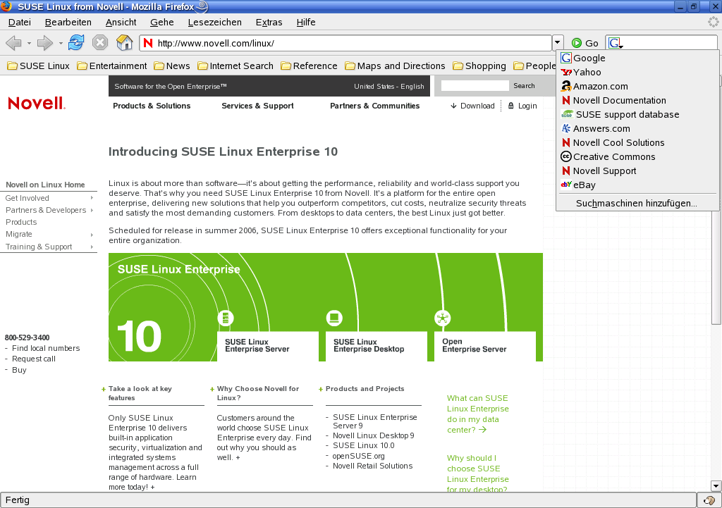 Neben Konqueror enthält SUSE Linux Enterprise auch den Firefox-Webbrowser. Um Firefox zu starten, drücken Sie Alt+F2 und geben Sie firefox ein.