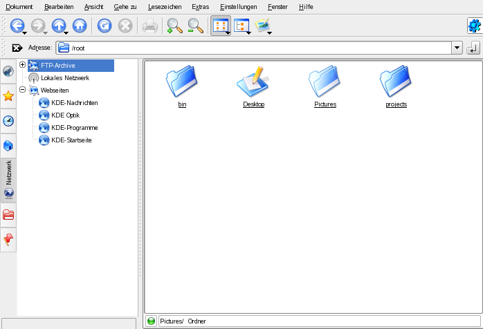 Konqueror ist Webbrowser, Datei-Manager sowie Dokumenten- und Bildbetrachter in einem. Mit der Datei-Manager-Funktion können Sie Dateien anzeigen, verwalten und erstellen, und allgemein Ihr Dateisystem so organisieren, wie Sie das möchten.