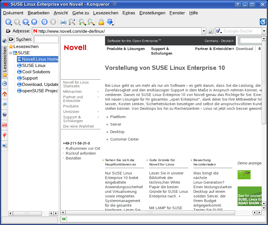 Um Konqueror als Webbrowser zu verwenden, geben Sie einfach einen URL in die Suchleiste ein. Wie bei Firefox* ist bei Konqueror ebenfalls "Tabbed Browsing" möglich. Dies bedeutet, dass Sie eine Seite im Hintergrund laden können, während Sie eine andere lesen. Um in Konqueror einen leeren Karteireiter zu öffnen, drücken Sie Ctrl+Shift+N, und geben Sie einen neuen URL ein. Sie können auch mit der rechten Maustaste auf einen Link der aktuell angezeigten Website klicken und wählen. Klicken Sie mit der rechten Maustaste auf einen Karteireiter, um auf weitere Karteireiteroptionen zuzugreifen, wie das Neuladen, das Duplizieren oder das Schließen von Karteireitern.