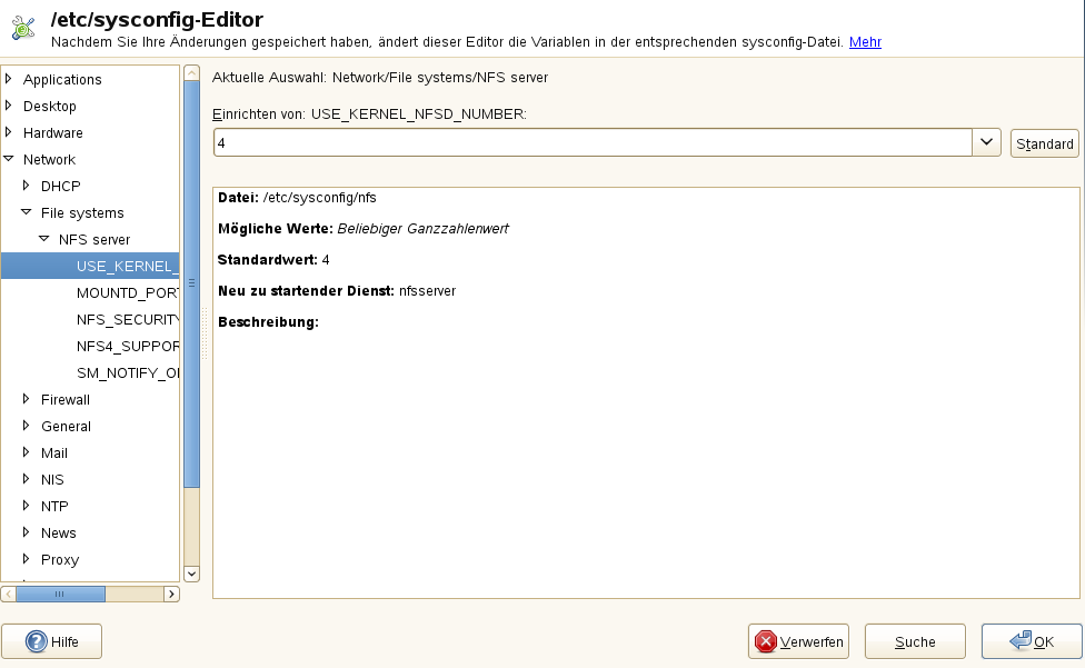 Sie haben zwei Möglichkeiten, die Systemkonfiguration zu bearbeiten. Entweder verwenden Sie den YaST-Editor "sysconfig" oder Sie bearbeiten die Konfigurationsdateien manuell.
