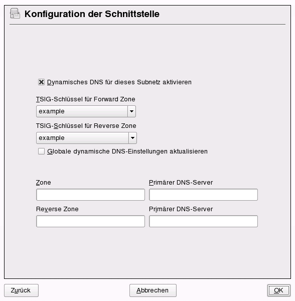 Jetzt können Sie das dynamische DNS für das Subnetz aktivieren, indem Sie wählen. Danach wählen Sie in der Dropdown-Liste die TSIG-Schlüssel für Forward und Reverse Zones. Vergewissern Sie sich dabei, dass die Schlüssel für den DNS- und den DHCP-Server dieselben sind. Mit der Option aktivieren Sie die automatische Aktualisierung und Einstellung der globalen DHCP-Servereinstellungen entsprechend der dynamischen DNS-Umgebung. Nun legen Sie fest, welche Forward und Reverse Zones über das dynamische DNS aktualisiert werden sollen. Dafür geben Sie den primären Namenserver für beide Zonen an. Wenn der Namenserver auf demselben Host wie der DHCP-Server ausgeführt wird, können Sie diese Felder leer lassen. Wenn Sie wählen, gelangen Sie wieder zum Dialogfeld für die Subnetzkonfiguration (siehe Abbildung 22-8). Wenn Sie noch einmal auf klicken, gelangen Sie wieder zum ursprünglichen Dialogfeld für die Expertenkonfiguration.