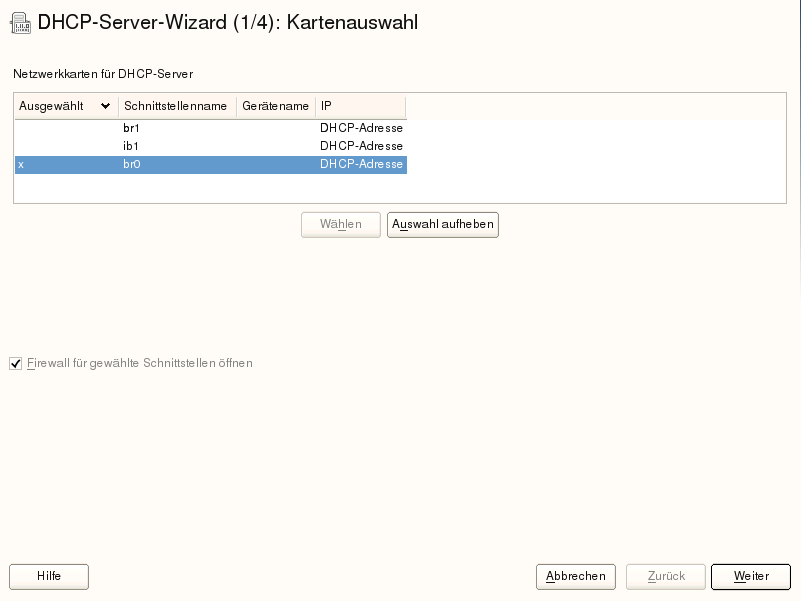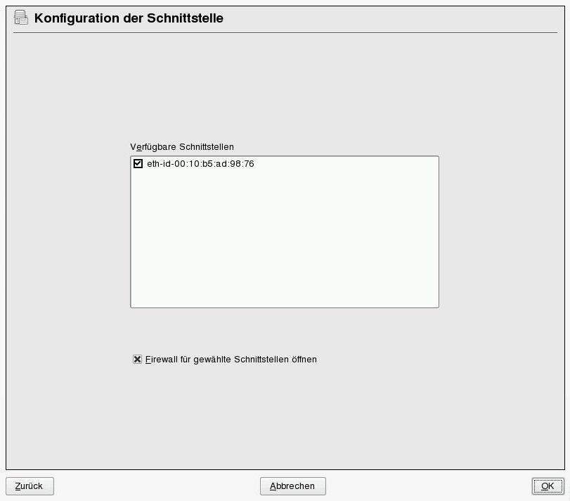 Im ersten Schritt ermittelt YaST die in Ihr System eingebundenen Netzwerkschnittstellen und zeigt sie anschließend in einer Liste an. Wählen Sie in dieser Liste die Schnittstelle aus, auf der der DHCP-Server lauschen soll, und klicken Sie auf . Wählen Sie anschließend die Option , um die Firewall für diese Schnittstelle zu öffnen. Weitere Informationen hierzu finden Sie unter Abbildung 22-1.