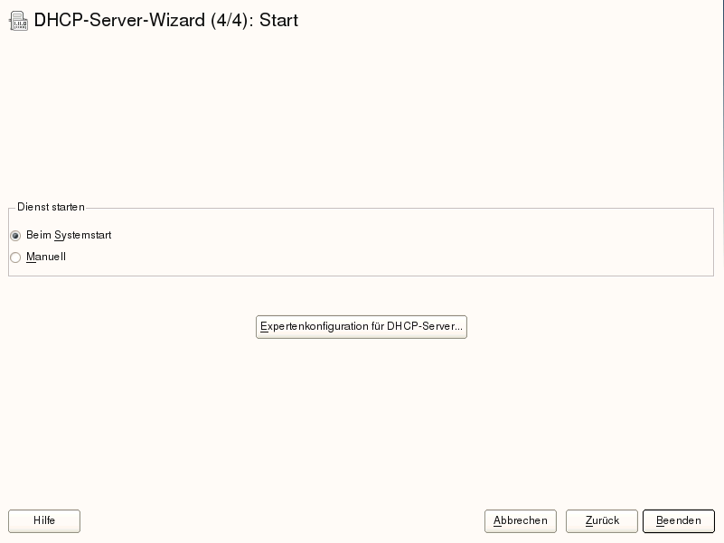 Nachdem Sie den dritten Teil des Konfigurationsassistenten abgeschlossen haben, gelangen Sie in ein letztes Dialogfeld, das sich mit den Startoptionen des DHCP-Servers befasst. Hier können Sie festlegen, ob der DHCP-Server automatisch beim Booten des Systems oder bei Bedarf (z. B. zu Testzwecken) manuell gestartet werden soll. Klicken Sie auf , um die Konfiguration des Servers abzuschließen. Weitere Informationen hierzu finden Sie unter Abbildung 22-4.