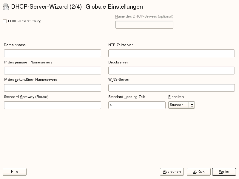 Geben Sie anhand des Kontrollkästchens an, ob Ihre DHCP-Einstellungen automatisch von einem LDAP-Server gespeichert werden sollen. In den Eingabefeldern legen Sie die Netzwerkinformationen fest, die jeder von diesem DHCP-Server verwaltete Client erhalten soll. Diese sind: Domänenname, Adresse eines Zeitservers, Adressen der primären und sekundären Namenserver, Adressen eines Druck- und WINS-Servers (für gemischte Netzwerkumgebungen mit Windows- und Linux-Clients), Gateway-Adressen und Leasing-Zeit. Weitere Informationen hierzu finden Sie unter Abbildung 22-2.