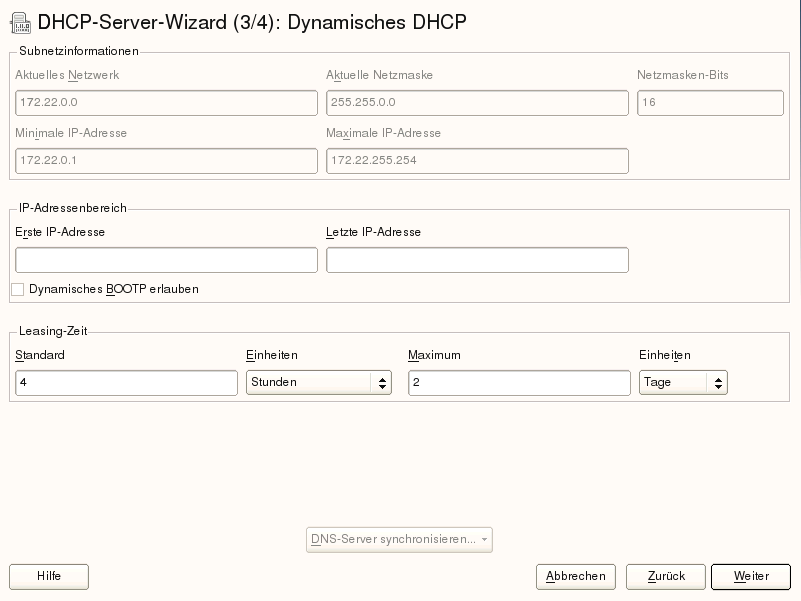 In diesem Schritt konfigurieren Sie die Vergabe der dynamischen IP-Adressen an Clients. Hierzu legen Sie einen Bereich von IP-Adressen fest, in dem die zu vergebenden Adressen der DHCP-Clients liegen dürfen. Alle zu vergebenden Adressen müssen unter eine gemeinsame Netzmaske fallen. Legen Sie abschließend die Leasing-Zeit fest, für die ein Client seine IP-Adresse behalten darf, ohne eine Verlängerung der Leasing-Zeit beantragen zu müssen. Legen Sie optional auch die maximale Leasing-Zeit fest, innerhalb derer eine bestimmte IP-Adresse auf dem Server für einen bestimmten Client reserviert bleibt. Weitere Informationen hierzu finden Sie unter Abbildung 22-3.