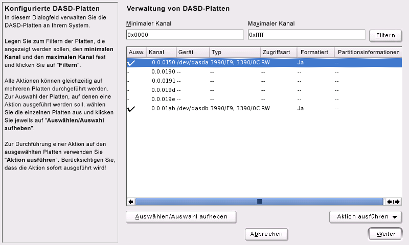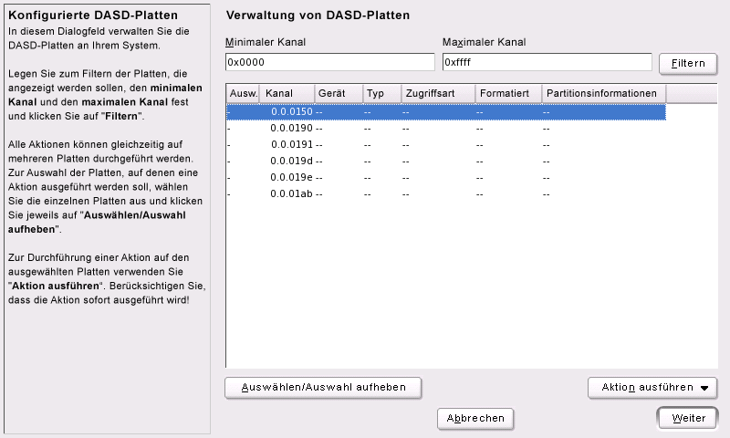 Nach der Auswahl von (Konfigurieren von DASD-Datenträgern) werden alle verfügbaren DASD-Festplatten in einer Übersicht angezeigt. Geben Sie für ein klareres Bild der verfügbaren Geräte einen Bereich der anzuzeigenden Kanäle in das Eingabefeld über der Liste ein. Um die Liste nach einem solchen Bereich zu filtern, wählen Sie . Weitere Informationen hierzu finden Sie in Abbildung 6-3.